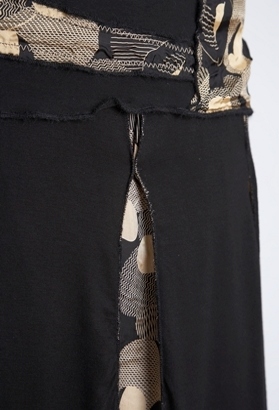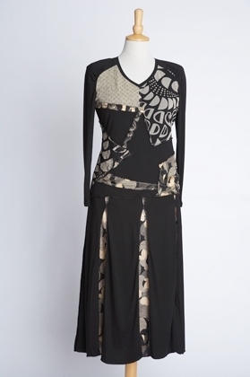 Black/cream two piece Black jersey top with cream/black fabric inserts and panelled black jersey skirt with cream/black inserts at the front. |