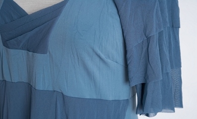 Layered Dress An easy stretchy dress with layered sleeves and front panels, available in teal blue or purple. The fabric has a crinkled finish. |