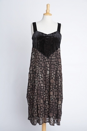 Circles Dress Empire line dress with crushed velvet bodice and shaped skirt in soft fabric with shaded circle design. |