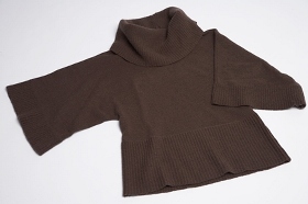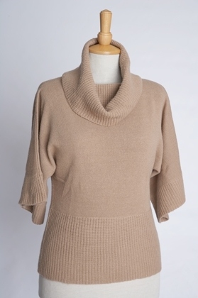 Cowl neck sweater A fitted sweater with large cowl neck and flared three-quarter sleeves. Available in camel or chocolate. |