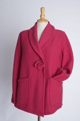 Fuchsia Jacket Unstructured 'boiled' wool jacket with patch pockets and pin fastening with large fabric flower. |